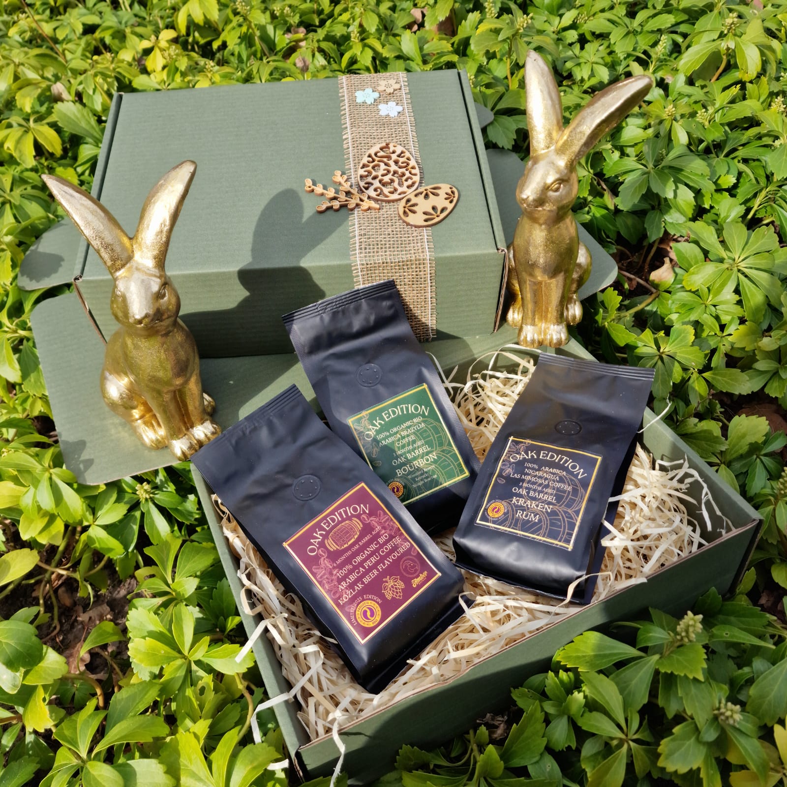Całość zapakowana w zielony ozdobny karton (zające nie wchodzą w skład zestawu).