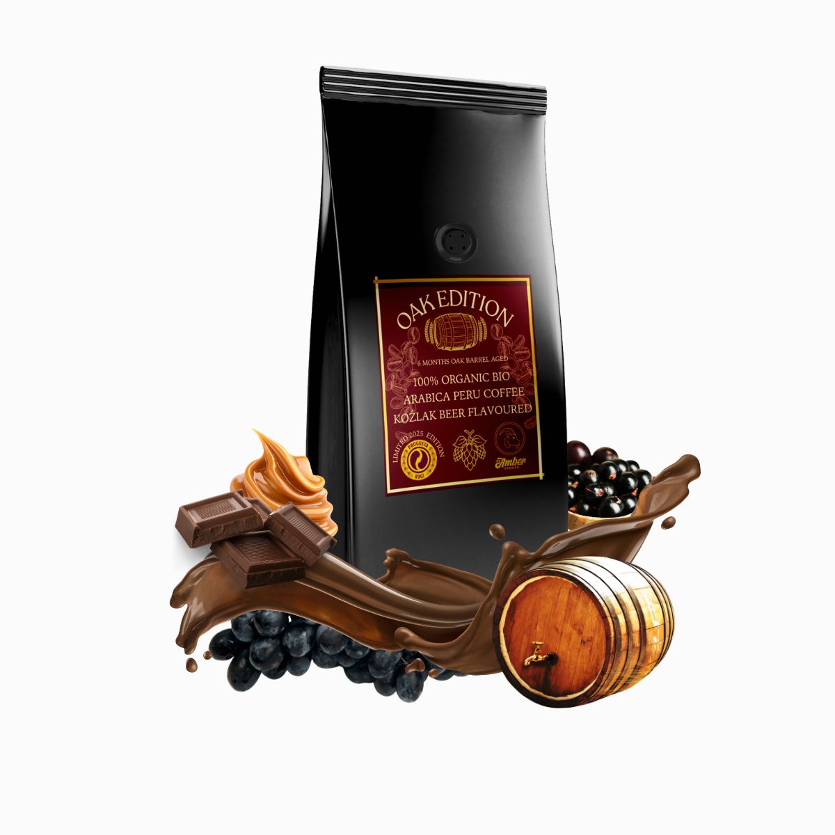 1. Ręcznie zbierane ziarna Arabiki z Peru na wysokości 1500–1800 m n.p.m. przez 6 miesięcy dojrzewały w beczce po czerwonym winie z hiszpańskiej Winiarni Emina. Następnie przez dwa lata leżakował Koźlak z Browaru Amber – klasyczny, treściwy bock.