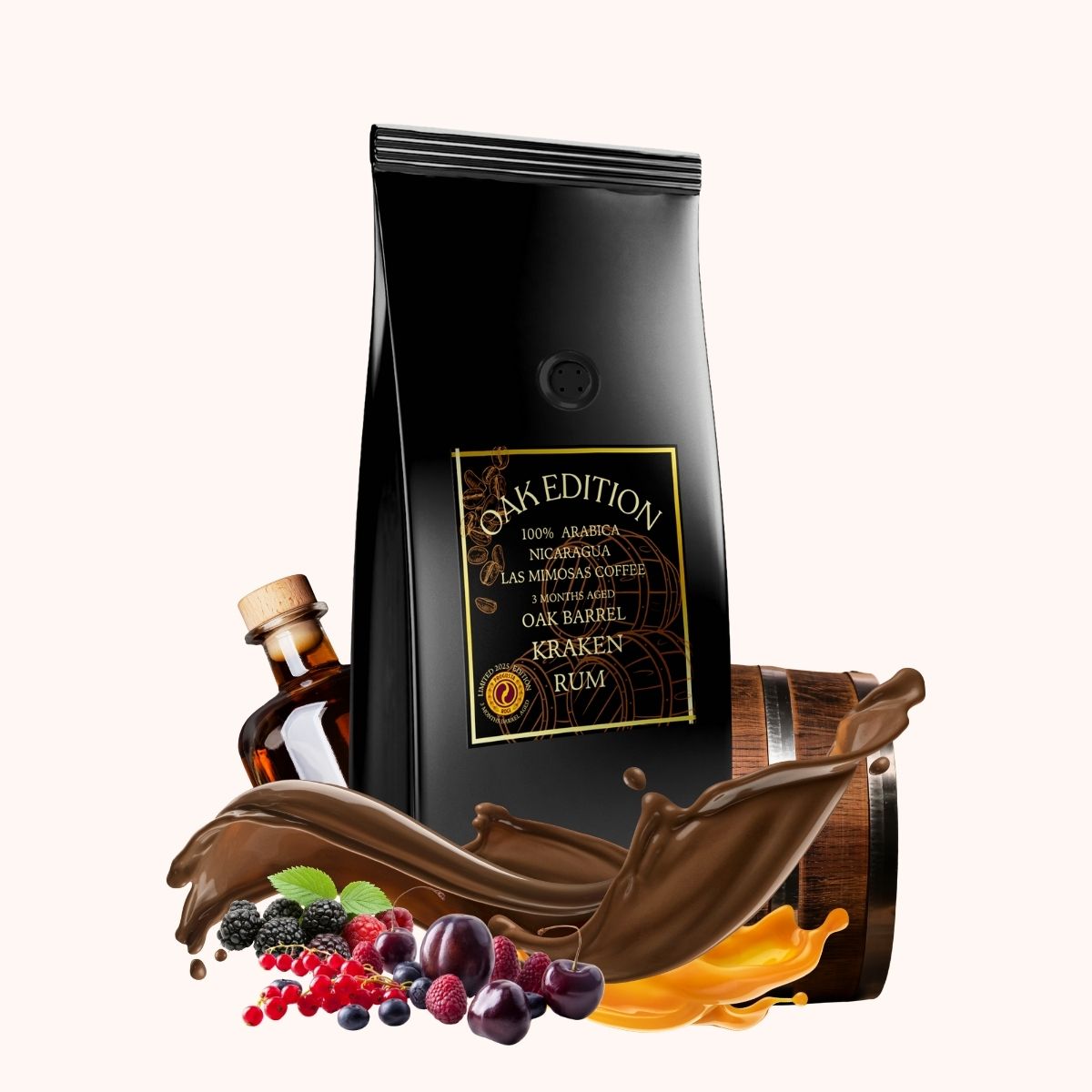 2. Ręcznie zbierane ziarna Arabiki, uprawiane w Nicaragua leżakowane przez 3 miesiące w beczce po Rumie Kraken, w której najpierw leżakowało wino czerwone Malbec oraz miód pitny.