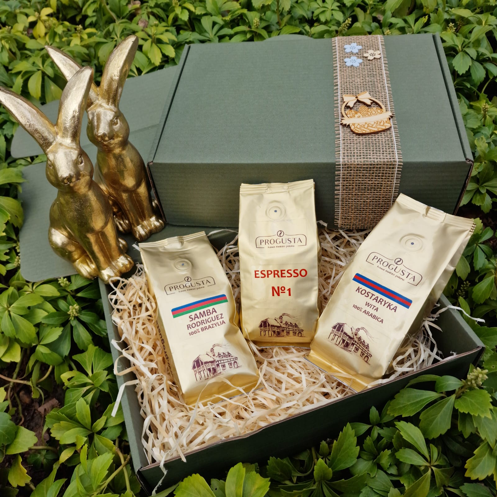 Całość zapakowana w zielony ozdobny karton (zające nie wchodzą w skład zestawu)